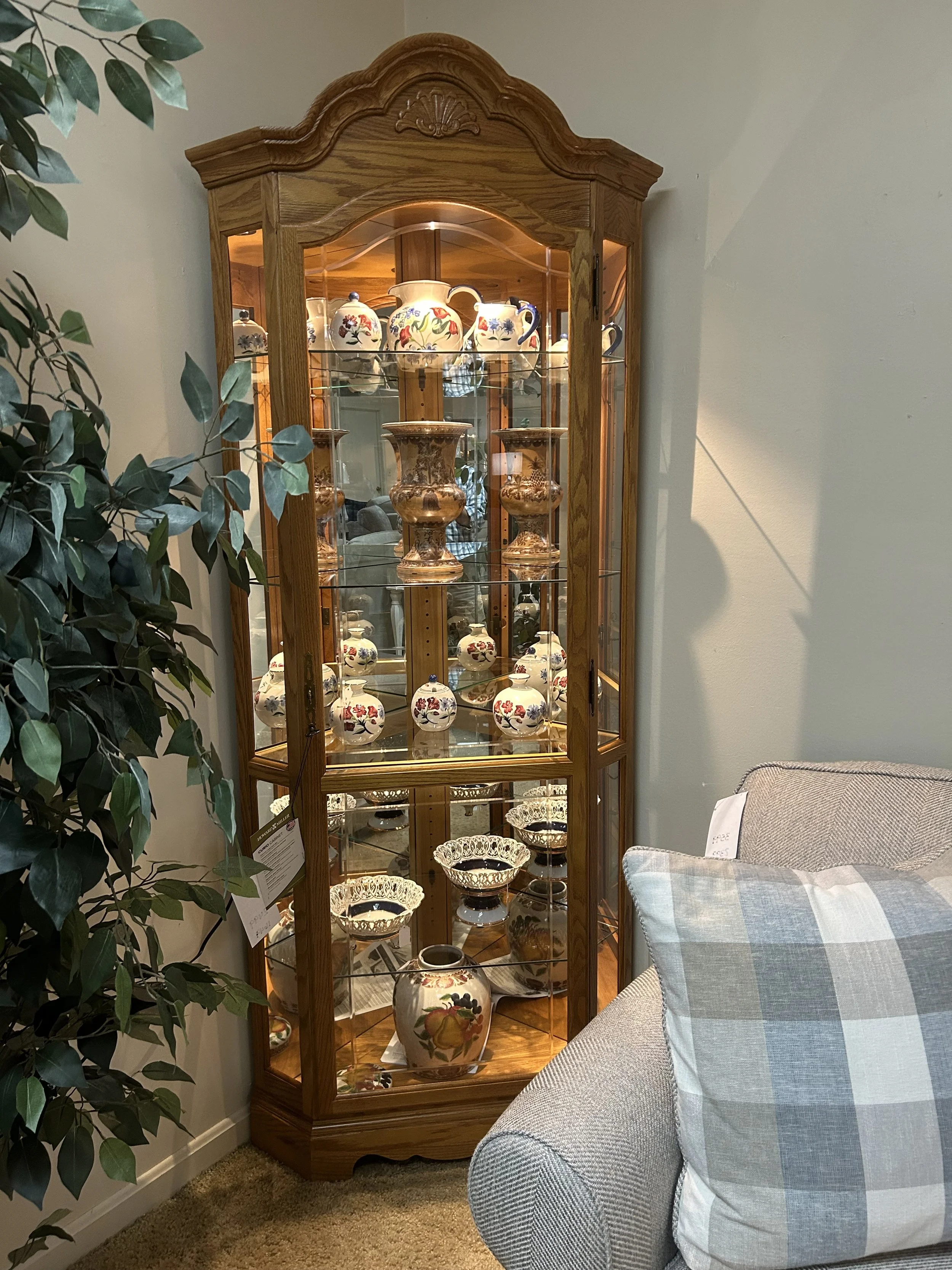 Howard Miller - Wilshire corner curio in Golden Oak finish (H: 82.25“ x W: 34“ x D: 21“)