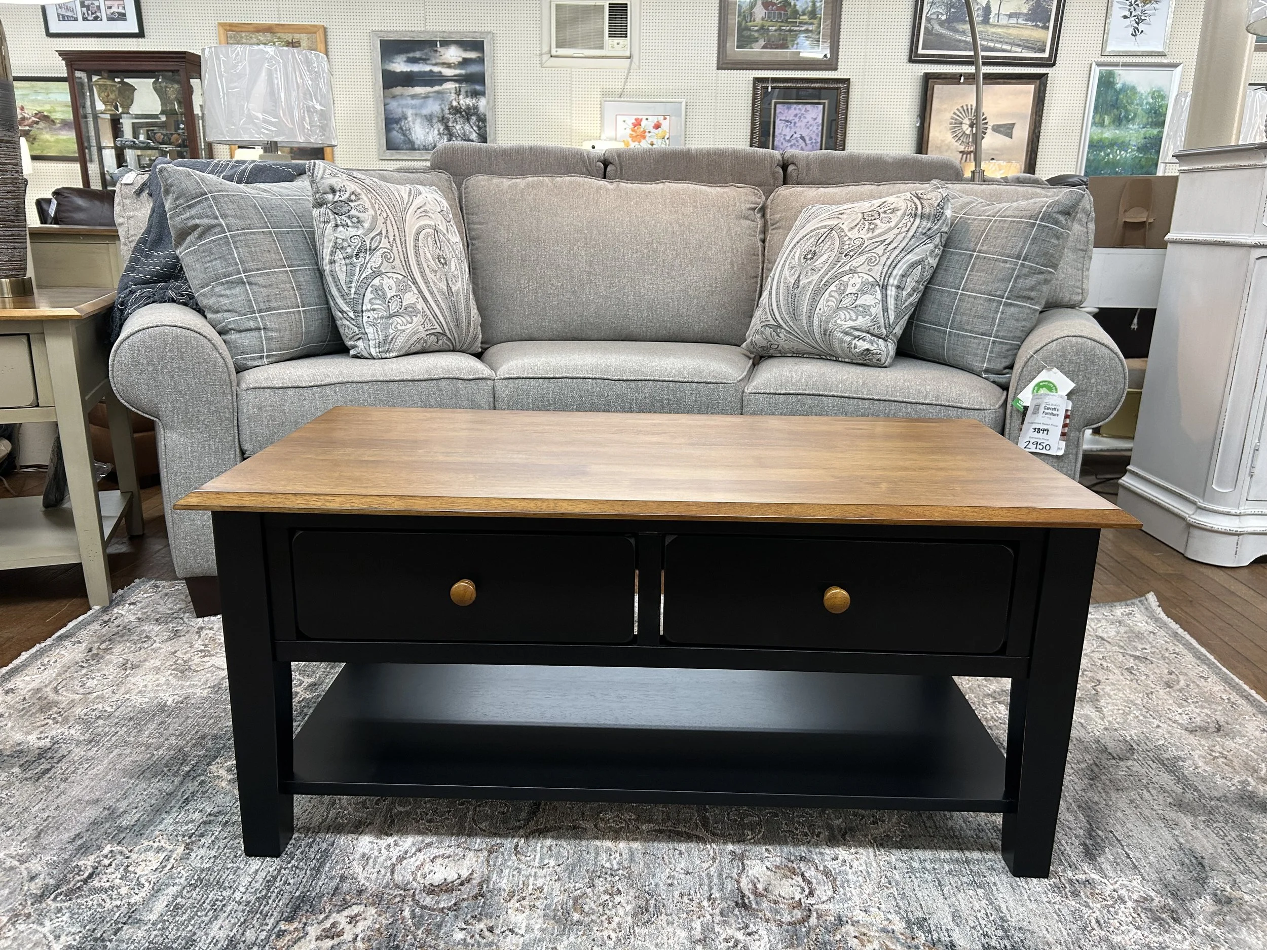 Coffee table with two slide-thru drawers in white and pecan finish by Null